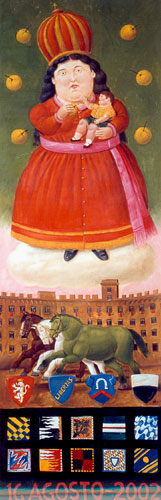 Entonces empiezan las banderas. Cada contrada desfila por la pista, con trajes casi bufonescos, ondeando las banderas que les corresponden, haciendo con ellas malabares increíbles. Soldados medievales los acompañan y las diez contrade que compiten traen al caballo que ha sido bendecido en la iglesia del barrio. Las siete que no participaran, despliegan de igual manera los colores de su contrada. La gente aplaude las tres primeras, pero ya las siguientes catorce se hacen repetitivas. Además, los ánimos se van caldeando: hay discusiones en las gradas, peleas en la plaza, impaciencias y gritos. Otro cañonazo y las palomas dan una vuelta anticipando el recorrido por el que estamos esperando. Los caballos entran al palacio mientras desfila el premio: el palio es un banderín con la imagen de la virgen, que en esta ocasión ha sido pintada por Botero. Todos adoran la imagen mientras la carroza que la conduce rodea la plaza.