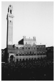 El Palazzo Público, el edificio más importante de la ciudad, está adornado con la bandera de cada una de las 17 contrade. Al frente, la calle empedrada que rodea la inmensa Plaza del Campo, ha sido cubierta con una capa de tierra de unos 5 centímetros de espesor.