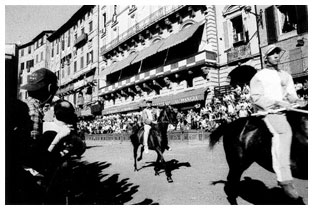 El cañonazo de las cuatro nos pone de pie. La policía saca a la gente de la pista y una división de caballería militar da una vuelta al trote. Sorpresivamente para mí, el líder grita al completar el giro y los seis u ocho jinetes se lanzan a toda marcha con sus espadas amenazantes erguidas hacia el frente. La gente delira y los jinetes abandonan Il Campo al completar la vuelta.