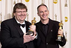 Michael Moore representó el stand up comedy más predecible y menos original de su carrera, con un juego de palabras plagiado de La guerra del golfo no tuvo lugar de Jean Baudrillard: "estamos peleando una guerra falsa, por motivos falsos