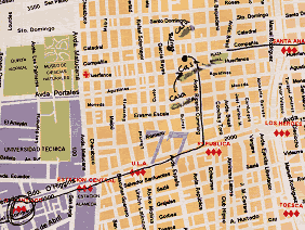 Una cuadra hacia el sur de la Plaza de Armas está el cruce del paseo la Ahumada con Huérfanos, las dos principales calles del centro (los caraqueños podrían imaginarse dos bulevares de Sabana Grande). Una cuadra mas hacia el sur y otra hacia el oeste está el Palacio de la Moneda, la casa de gobierno donde asesinaron a Allende.