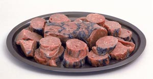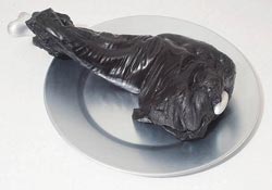 Si bien es cierto que algunos de mis cuadros tenían nombres como ‘Avileña’, ‘Tepuy’, ‘Talamanca’, o mis vegetaciones como ‘Merecure’, ‘Dividive’, ‘Caobo’, etc., nunca han sido producto de imitación de la naturaleza como tal. Y en el caso de mis ‘paisajes domésticos’, las ‘hallacas’ son producto de mi investigación con las resinas sintéticas, y si ésas obras se pueden apreciar, en cierto sentido algo realistas, no fue ésa la intención. El fin no era plantearme la hallaca como tal, sino saber que emociones podría generar dentro de un contexto de otras obras irreverentes y abstractas. De todas maneras, éstas obras que comentas fueron las de mis primeros intentos con el tema culinario. Y en el caso de las caraotas, bueno, se trata en realidad de unas paraparas, que cumplen una función afín al lado de un objeto aleatorio, un accidente de polietileno negro que rememora una rama con frutos como semillas, o algo así, relación que me pareció interesante al agregarle al plato soporte muchas más de ésas semillas. Y en el de los salchichones, bueno, ésa pieza es producto de un desecho tubular de extrusora, totalmente aleatorio, rojo, de polietileno, que al yo cortarlo en forma de rodajas lo hacen ver en su disposición sobre una bandeja, como si se tratara de unos embutidos cárnicos!, pero mejor observado el objeto, descubrirás que es el mismo planteamiento abstracto sobre el soporte figurativo.