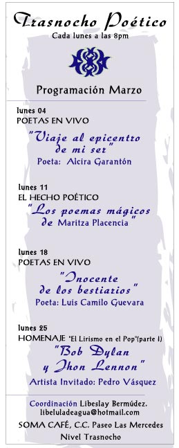 Cada lunes a las 8:00 p.m. SOMA CAFÉ - Final Av. Principal de Las Mercedes, Centro Comercial Paseo Las Mercedes, Nivel Trasnocho (sótano). Caracas. Ver folleto