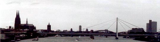 Al llegar a tierra firme, la cola para entrar a las torres de la catedral es inmensa. Hay misa, imagino que es el siguiente turno. Frente a la catedral hay muchísima gente, es domingo y el lunes es libre por pentecostés o Pfingstmontag, asi que la cantidad de turistas es poco normal. Al lado de la catedral se encuentran dos museos: el Ludwig y el museo de artes románicas y germánicas. El primero es es un museo devoto a las distintas tendencias plásticas del siglo XX ; el segundo es un museo casi arqueológico famoso por su colección de mosaicos y cristales. Pero es casi mediodia y decido comer y sentarme un rato antes de decidir. Camino, buscando algo que tomar y un sitio donde comer, hasta el Rathaus, lo que vendría a ser la alcaldía, que también alberga un museo de arte del siglo XV, pero se encontraba cerrado, asi que camino hasta el Rhin, donde hay un parquecito y mucha gente tomando sol.