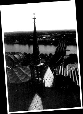 El aspecto de la iglesia es de descuido. Oscura de sucio y moho, oculta sus formas y apenas se identifican algunas de las gárgolas que de vez en cuando son sustituídas por un hombre que gritará agua con la lluvia. En el campanario se encuentra la campana más grande del mundo y desde el tope se tiene clara visibilidad de Colonia, desde el centro histórico hasta las plantas nucleares que pueblan las afueras, hacia el este, si mis habilidades cartográficas no son tan malas. La subida es agotadora pero el panorama es una excelente recompensa.
