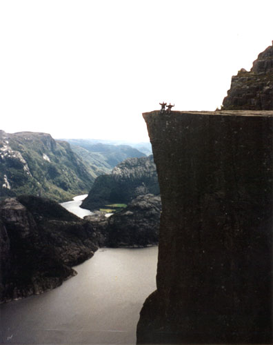 Con el fiordo de lado y al pasar una hora más de veredas y desfiladeros nace una gárgola de la montaña, un plató rocoso natural de 25 metros cuadrados elevándose a 604 mts.