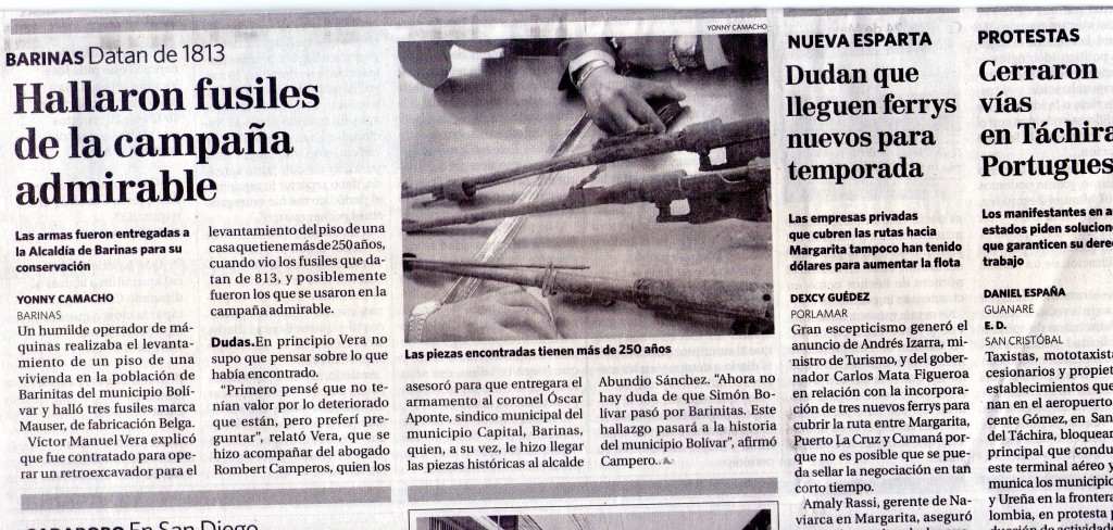 En este caso, el Nacional en su edición del día Viernes 24 de Mayo de 2013 en el cuerpo de Ciudadanos publica que se encontraron debajo de una casa de 250 años de antigüedad unos «fusiles Mauser de fabricación Belga» que datan de 1813 y que pertenecen a la Campaña Admirable, reseñando esto como prueba histórica de que Bolívar pasó por Barinitas.