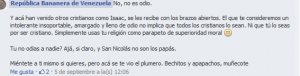 «Aunque como ya dije, esperé demasiado de una cuerda de fanáticos religiosos que comparan al cristianismo latinoamericano con los morenazis (se nota que aún no han superado la etapa de la rebeldía adolescente donde tantos carajitos se vuelven ateos solo por llevarle la contraria a sus padres).»