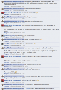 ACLARACIÓN: a mí me da igual lo que me digan, estoy acostumbrado a ser insultado por Internet y a ser víctima del «chalequeo» venezolano. Normalmente me limito a responder con la misma moneda y ahí termina todo. La razón por la cual me decidí a hacer este artículo es por que me duele bastante ver a gente inteligente, gente que se supone son parte de la élite intelectual de la nación, caer en los mismos vicios que nos tienen jodidos como país. Esa es la auténtica razón. Si estos insultos me los hubieran hecho, por ejemplo, en las Alpargatas de Páez, Arepachan o sitios así, tengan por seguro que aquí no hubiera dicho ni pío sobre el tema, por que no merecía un artículo al respecto. Por último, pero no menos importante, los insultos y amenazas que solté por la RBV fueron después de la oleada de insultos descrita acá, excepto cuando amenacé de muerte a los tupamaros. Sí, pienso que en caso de un combate campal entre una marcha pacífica opositora y los tupamaros, deberíamos luchar por nuestras vidas y si morimos, al menos llevarnos por delante a cuánto tupamaro podamos. Aquí nadie propone una campaña de exterminio (aunque sí de desarme) de los tupamaros o algo así.